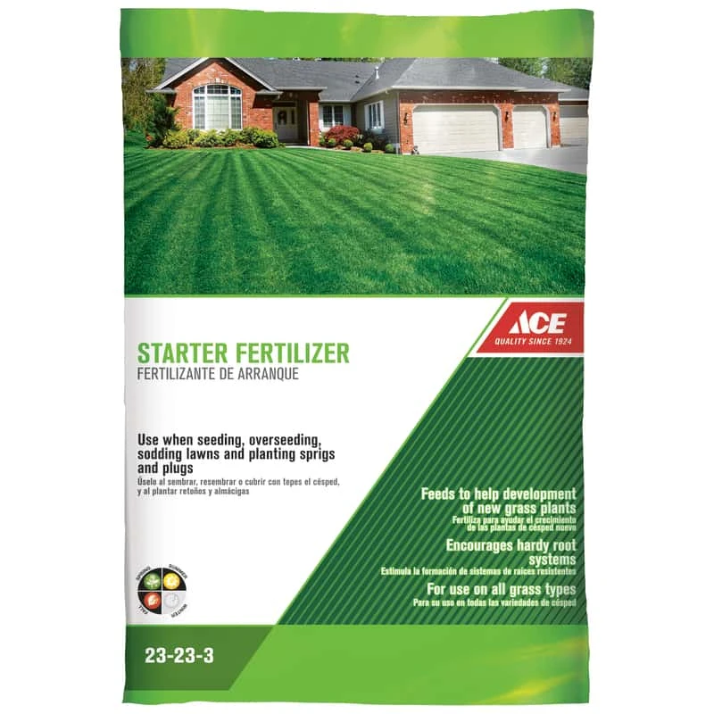 Ace Starter Fertilizer feeds your lawn in one easy step to establish lush new grass and encourage hardy root systems. For use on all grass types Feeds to help development of new grass plants Should be used when seeding, overseeding, sodding lawns and planting sprigs and plugs