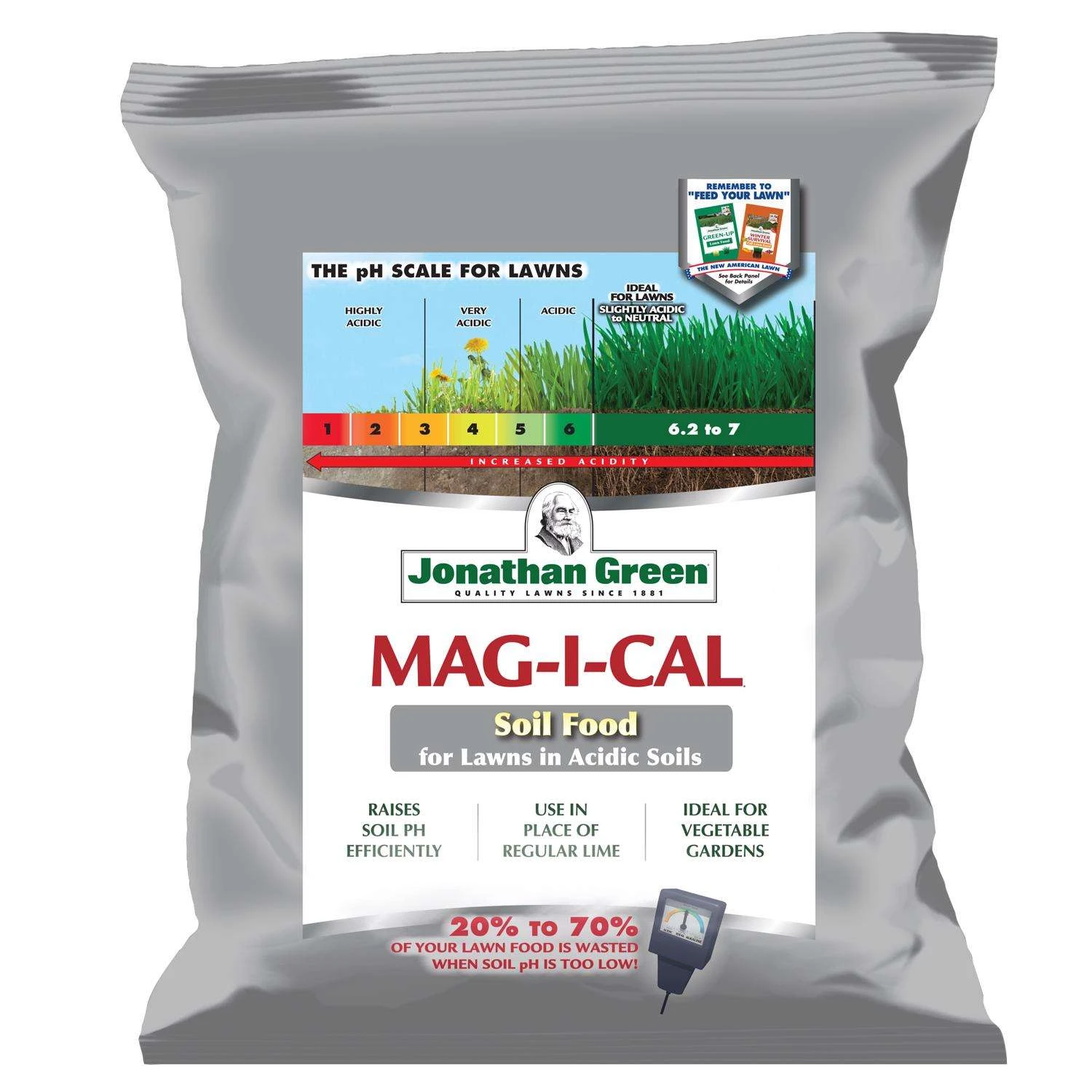 Jonathan Green’s Mag-I-Cal for Lawns in Acidic Soil contains calcium carbonate in a completely soluble form that is immediately available to adjust soil pH upwards. Poor soil is often the problem in growing a great lawn and calcium is vital to many grass plant functions. Lawns thrive in soil with pH levels between 6.2 and 7.0. When the pH level of the soil is below this range grass becomes light green, weeds persist and fertilizer nutrients are not fully absorbed. Mag-I-Cal Plus also contains humates to stimulate soil microbial life. When soil chemistry and biology are balanced, nutrients from lawn foods are not wasted and the grass will thrive. For best results, rake the lawn vigorously prior to application. Use a rotary or drop lawn spreader. To select the proper setting see the Spreader Settings section in the accordion below. Apply around the perimeter of the lawn to establish a turning area. Then run the spreader back and forth within the area outlined by your first perimeter application. Always allow overlap to avoid gaps in coverage. Releases trapped nutrients in the soil One bag of Mag-I-Cal has the pH adjusting power of up to 15 bags of limestone Rapidly and efficiently raises soil pH Calcium and humates balance soil pH and stimulate microbial life Encourages nutrient absorption Best applied during the growing season when the soil is not frozen Safe to apply when seeding or sodding Spread the product on a dry lawn soon after mowing Apply at any time and in combination with any other product Great for establishing new seedings